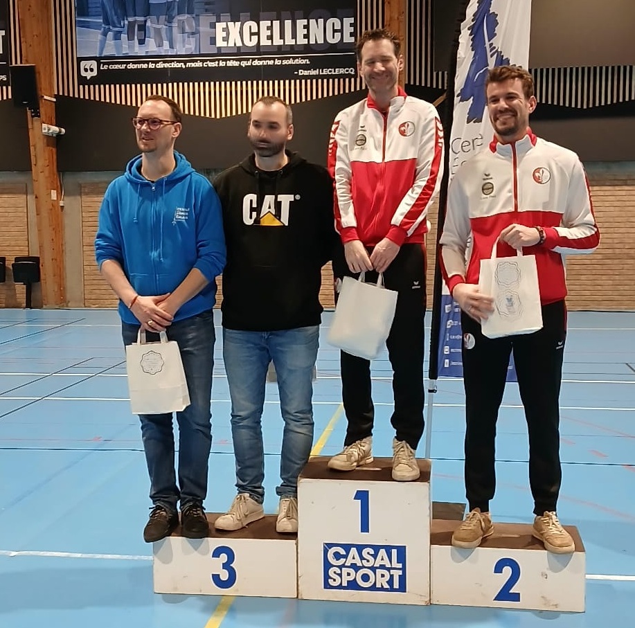 Chez les garçons Antoine réalisait un strike de 5 victoires en poule, Nils totalisait 4 victoires et 1 défaite, Fred et Grégoire 4 victoires et 2 défaites et François 1 victoire et 5 défaites. Seul douaisien non exempté du tableau de 64 François remportera son match 15/8. En tableau de 32 il sera éliminé 15/10 tandis que Antoine (15/13), Grégoire (15/14), Fred (15/11) et Nils (15/13) l’emportaient. Le tableau de 16 sera ensuite fatal pour Antoine, défait 15/11 par Grégoire mais aussi pour Fred défait 15/10 et Nils défait 15/13. Seul douaisien restant en quart de finale Grégoire l’emportera 15/14 avant de chuter 15/10 en demi finale. Grégoire signe donc à Amiens son premier podium régional depuis son arrivée à Douai, il devance au classement Antoine 10e, Nils 12e, Fred 13e et François 32e.